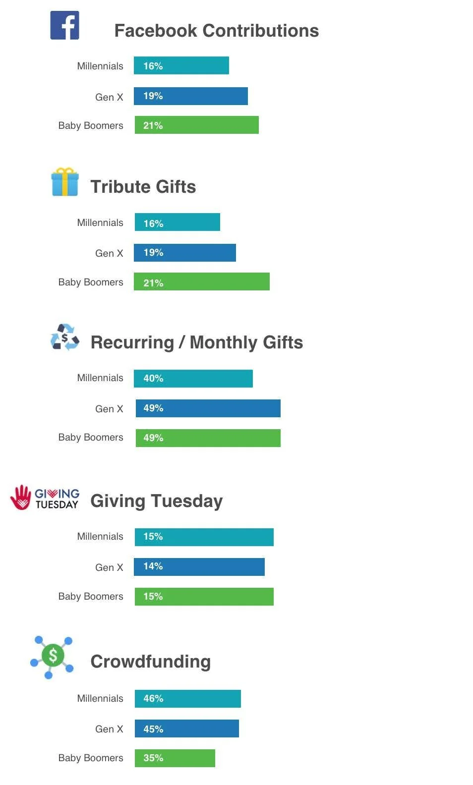 Primary users will likely be a female representation from each demographic as all three generational categories are pro-active donors. The user will desire the ability to discover opportunities and integrate their activities through social media. For convenience, they will want the option to schedule recurring gifts, make tribute gifts, and share their giving experience via social media. To accommodate the income variance from Millennials to Baby Boomers, an assortment of gift pricing options should be provided. Users would like the ability to receive confirmations and receipts via text messaging. The user wants the satisfaction of making an impact on the life of someone within their local sphere. Crowdfunding initiatives are seen as an opportunity to participate in a community effort and provide a viable return.