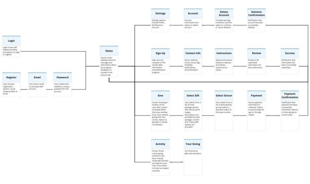 After my initial analysis and determining a list of requirements, I designed and laid out the initial user flow for the application.