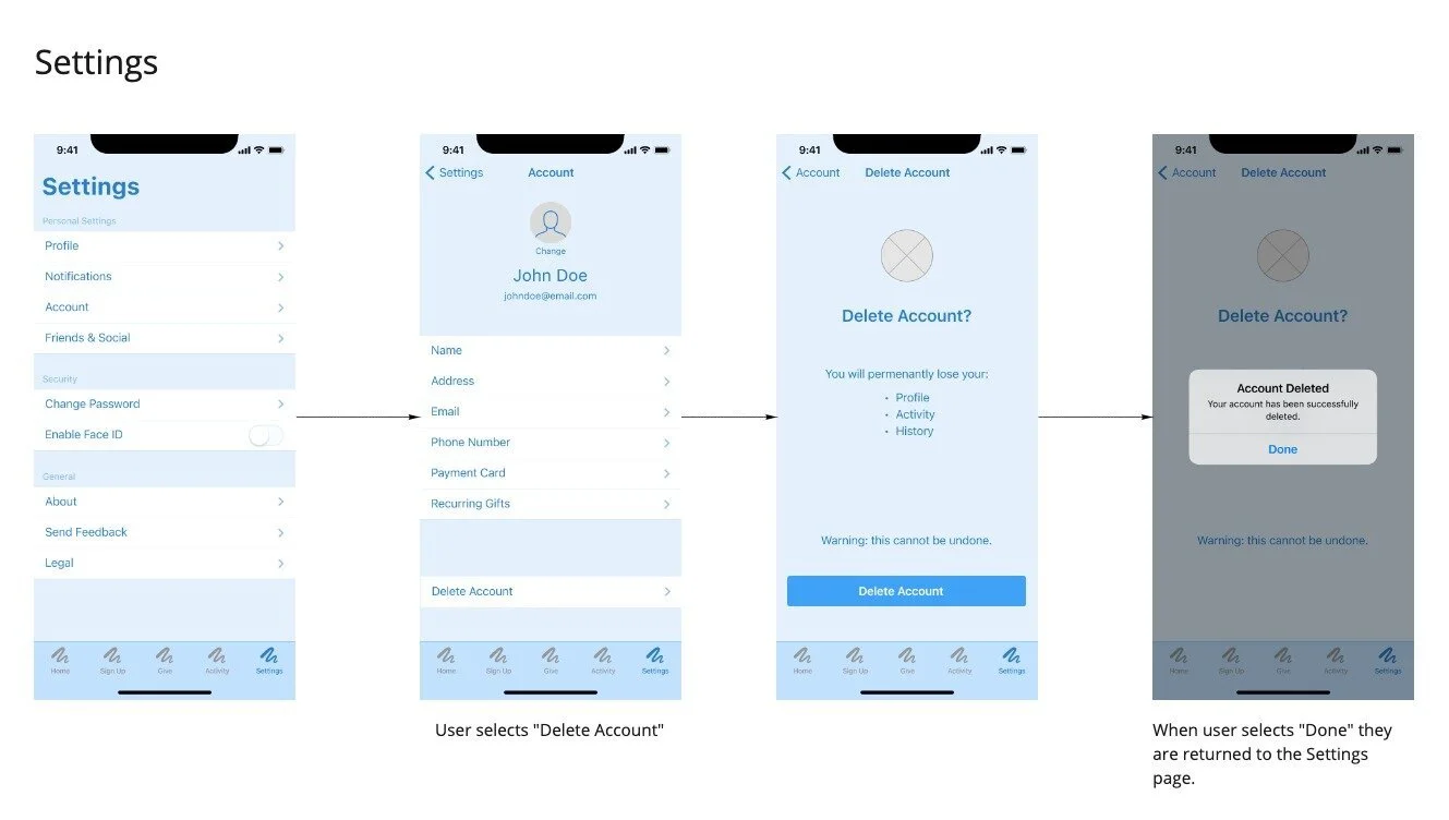 After making improvements to the initial design, I created high-fidelity wireframes for final review. Research showed that some nomenclature needed to be revised for clarity, the user flow for Delete Account needed to be adjusted, and the Activity feed needed to be revised to be consistent with functionality.